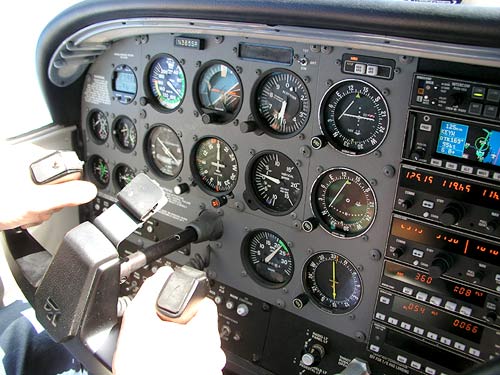 | Tady vidíte, že letadlo (které na hodinu nestálo víc, než 2.900 Kč) je vážně dost dobře vybavené. A někteří z nás měli i lepší. S VFR i IFR GPS a daląími libůstkami zpříjemňujícími život. Šlo by to i podstatně levněji, ale my jsme se báli - poprvé 3,5 hodiny přes moře.. Kde byla (ale na dokluz ne) nejbližším útočištěm jedině Kuba... Letěli jsme z Key West na Floridě do mexického Cancunu. |