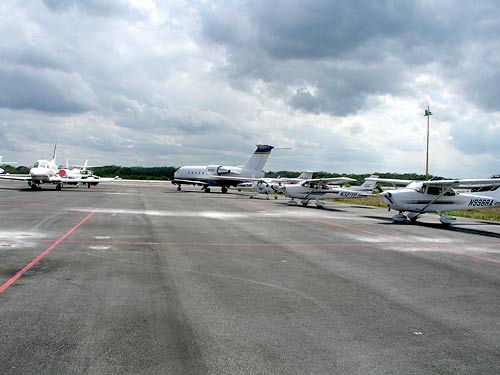| Kromě těch "našich" Cessen vpravo v Cancunu parkuje hodně dalších malých letadel. |